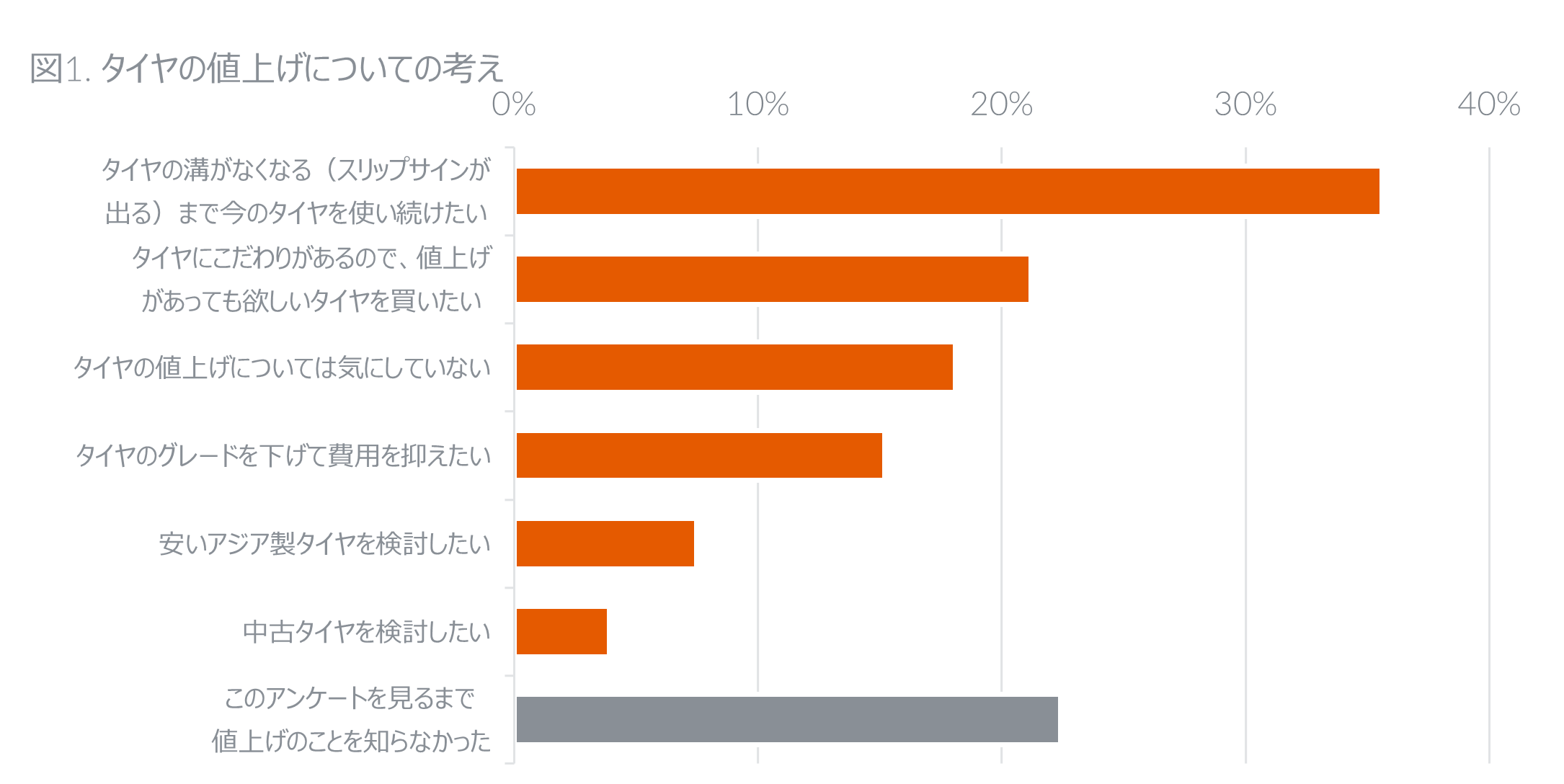 まずタイヤの値上げに対して。拘りがあり値上げでも欲しいタイヤを買いたいが全体の20%を超えています。値上げでも気にしないが20%弱。知らなかったが20%強。