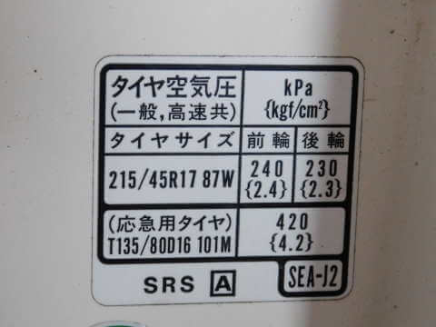 方法は2つ、ひとつはクルマの取説(オーナーズマニュアル)、もうひとつは運転席のドア後ろ側下か、センターピラーの下に貼ってあるラベルです。後者が一般的かな。そこにはサイズ、前輪・後輪の空気圧が表示されています。因みに写真は、前輪240kPa(2.4kgf/cm2)、後輪230kPa(2.3kgf/cm2)です。現在の数値表示はkPa(キロパスカル)、以前はkgf/cm2(キログラム重パー平方センチメートル?)でした。