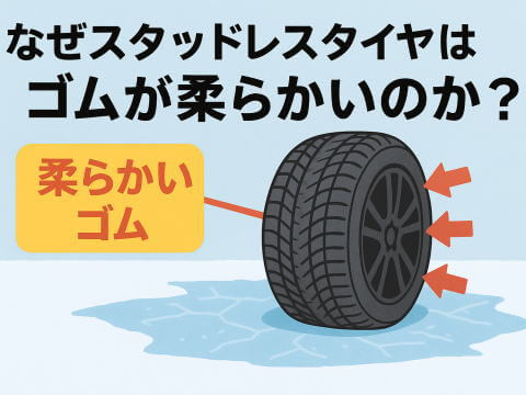 スタッドレスタイヤのゴムが柔らかい理由は、雪道や氷の上でもしっかりと路面をつかみ、安全に走行する為です。